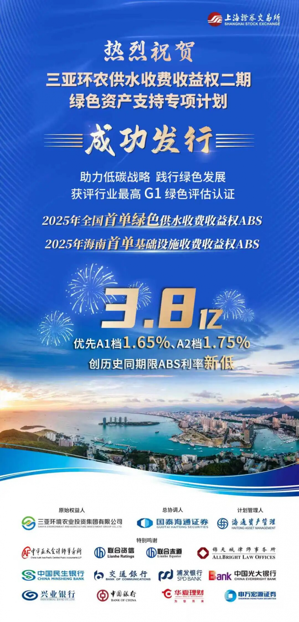 9月18日,三亞環(huán)農(nóng)集團成功發(fā)行2025年全國首單綠色供水收費收益權(quán)ABS與2025年海南首單基礎(chǔ)設(shè)施收費權(quán)益權(quán)ABS,實現(xiàn)了業(yè)務(wù)領(lǐng)域的重要突破。近日,該項目憑借卓越的創(chuàng)新性與示范價值,一舉斬獲中國金融前沿論壇(CFAF)2025年度三大重磅提名: