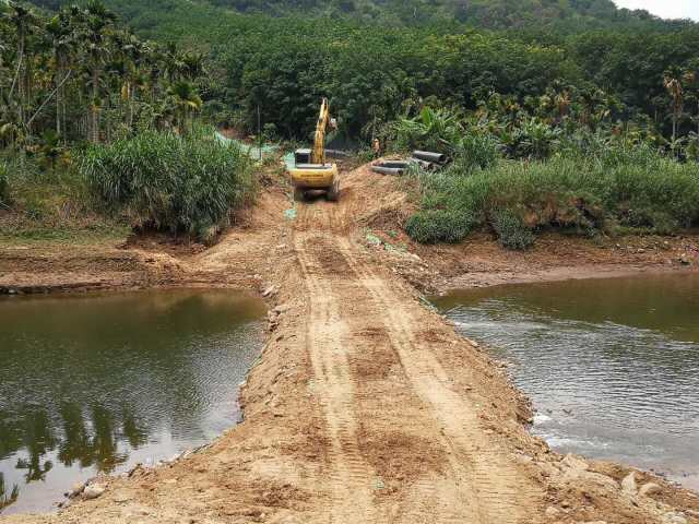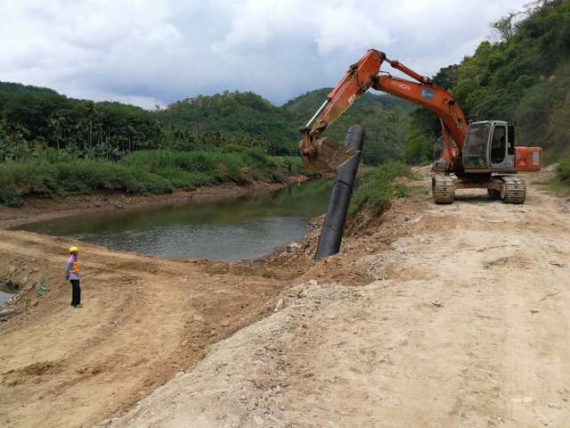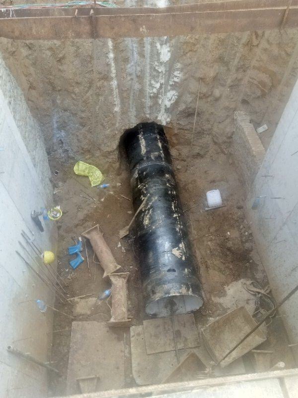 為穿越此唯一線路,管道需繞南塔水庫背面山頭敷設(shè),施工材料進(jìn)場需穿越南塔水庫上游河道,再用挖掘機(jī)一條條轉(zhuǎn)運(yùn)到施工點(diǎn)位上,而該河道是季節(jié)性河道,枯水期水較淺(約1m),豐水期水較深(達(dá)4m)。為此我司會同項(xiàng)目參建單位制定了多個(gè)專項(xiàng)施工方案,就目前枯水期采用填便道運(yùn)材料,若豐水期采用浮船方式運(yùn)材料。鑒于此河道高程較低,管道運(yùn)行壓力較高(達(dá)1.5Mpa左右),為保證管道運(yùn)行安全,經(jīng)計(jì)算,該段管材采用無縫鋼管,并且已經(jīng)搶在清明節(jié)前后(河道最為枯水的時(shí)間段)將溝槽挖好并埋入管道。