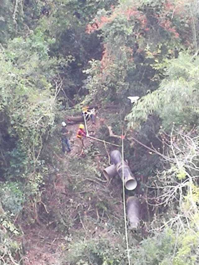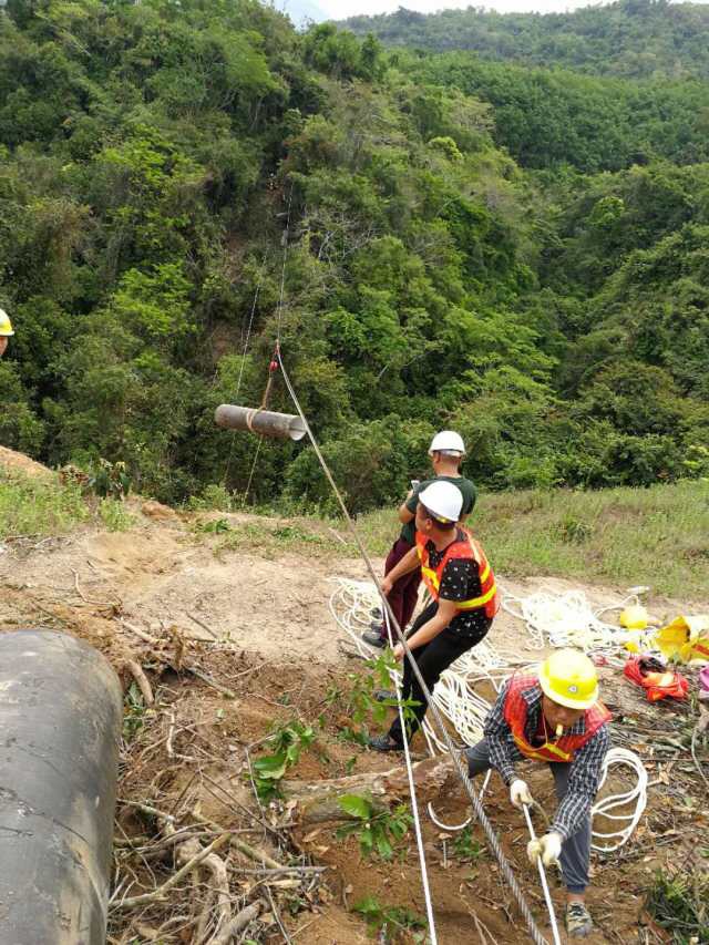 項(xiàng)目后段2.3KM的線路上溝塹較多,且跨度大,此情況只能采用傳統(tǒng)的人工架設(shè)鋼索運(yùn)輸?shù)姆绞剑瑢⒐懿暮蜋C(jī)械設(shè)備分批送過鄰山再進(jìn)行安裝后施工,并結(jié)合無人機(jī)這種現(xiàn)代化工具輔助勘查和運(yùn)輸配件。在這種傳統(tǒng)與現(xiàn)代相結(jié)合的立體化作業(yè)下,該段的工程爭取在兩個(gè)月的時(shí)間內(nèi)完成。