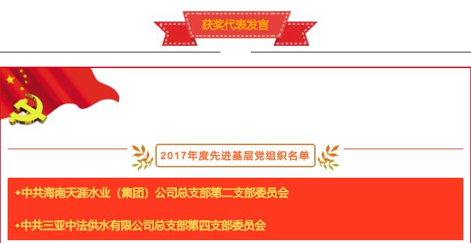 會議開始,由黨委委員高元昌同志宣讀《中共海南天涯水業(yè)(集團)公司委員會關(guān)于表彰2017年度先進基層黨組織、優(yōu)秀共產(chǎn)黨員和優(yōu)秀黨務(wù)工作者的決定》,通過表彰先進,激勵士氣,進一步動員廣大黨員干部職工解放思想,與時俱進,團結(jié)拼搏。大會對公司兩個先進基層黨支部、24名優(yōu)秀共產(chǎn)黨員、5名優(yōu)秀黨務(wù)工作者進行了表彰。先進基層黨組織、模范共產(chǎn)黨員、優(yōu)秀黨務(wù)工作者代表結(jié)合自身成長經(jīng)歷和工作實際在會上作了典型發(fā)言。