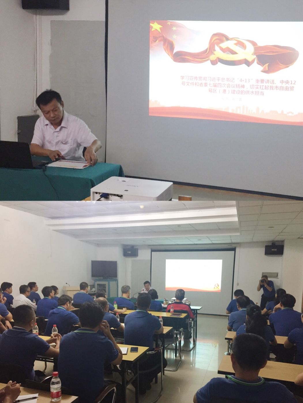 2018年7月5日,陳濤委員對集團公司第五黨支部全體黨員和群眾代表進行宣講,自由貿(mào)易區(qū)(港)的建設要推動形成全面開放新格局,解決本領恐慌的問題、解決干部作風問題、解決營商環(huán)境問題、解決工作方法問題;按照海南省委書記劉賜貴在省委七屆四次會議上的要求,扎實推進我省自由貿(mào)易區(qū)(港)建設,要堅決防止五種不良傾向等問題。
