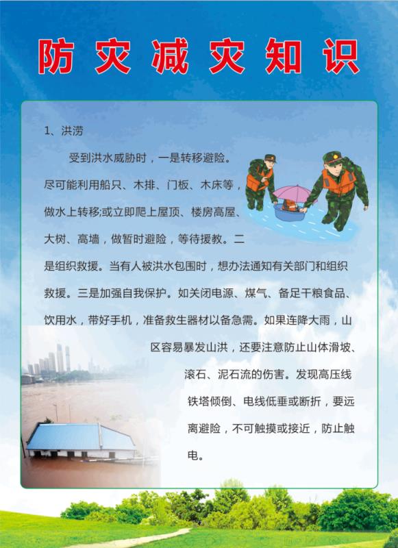 受到洪水威脅時,一是轉(zhuǎn)移避險。盡可能利用船只、木排、門板、木床等,做水上轉(zhuǎn)移;或立即爬上屋頂、樓房高屋、大樹、高墻,做暫時避險,等待援教。二是組織救援。當有人被洪水包圍時,想辦法通知有關(guān)部門和組織救援。三是加強自我保護。如關(guān)閉電源、煤氣、備足干糧食品、飲用水,帶好手機,準備救生器材以備急需。如果連降大雨,山區(qū)容易暴發(fā)山洪,還要注意防止山體滑坡、滾石、泥石流的傷害。發(fā)現(xiàn)高壓線鐵塔傾倒、電線低垂或斷折,要遠離避險,不可觸摸或接近,防止觸電。
