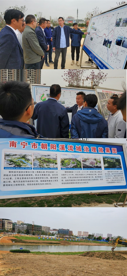 22日下午,考察組考察了南寧朝陽溪河道綜合整治工程建設(shè),該工程建設(shè)主要圍繞堤防護岸、清淤保障、蓄洪景觀湖、截污及溢流污染控制、海綿城市建設(shè)、景觀綠化等方面全方位治理,總投資25.58億元。