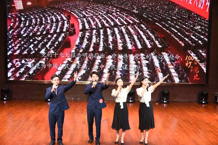 伴隨著奮斗百年路.啟航新征程視頻的歷史回顧,大會在環(huán)投集團(tuán)選送的大型舞蹈《花開盛世》中拉開序幕,舞蹈演員們身著華美的舞服步入舞臺,猶如一朵朵盛開的花朵,傳遞著祖國盛世的美好。隨后來自環(huán)投集團(tuán)、城投集團(tuán)等10支詩歌朗誦隊(duì)伍開始了以聲獻(xiàn)禮朗誦比賽,選手們通過新穎豐富的舞臺表現(xiàn)形式,展示了黨的百年歷程,頌揚(yáng)了黨的豐功偉績。環(huán)投集團(tuán)代表隊(duì)作為第一組登場的選手,為我們帶來了一組飽含深情的《百年頌歌》。每三個(gè)朗誦節(jié)目中間穿插豐富多彩的由各集團(tuán)選送的文藝表演,由我司黨委委員章梁同志領(lǐng)舞的《沂蒙頌》,鮮活再現(xiàn)了解放戰(zhàn)爭時(shí)期,黨和人民風(fēng)雨同舟、魚水情深的動人畫面。農(nóng)投集團(tuán)和旅投集團(tuán)也分別為在場觀眾帶來了歌伴舞《不忘初心》和樹葉口技《唱支山歌給黨聽》,環(huán)投集團(tuán)選送的舞蹈《錦繡前程》更是將觀眾帶到一個(gè)繁華似錦的美好世界。
