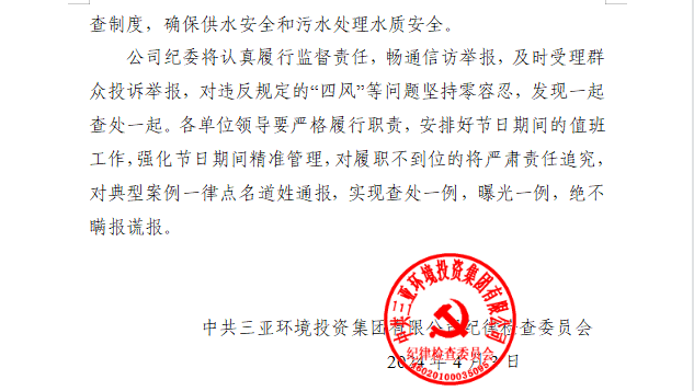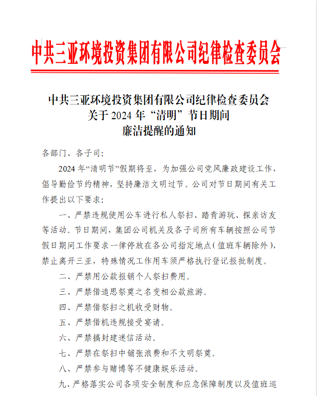 中共三亞環(huán)境投資集團(tuán)有限公司紀(jì)律檢查委員會(huì) 關(guān)于2024年“清明”節(jié)日期間 廉潔提醒的通知